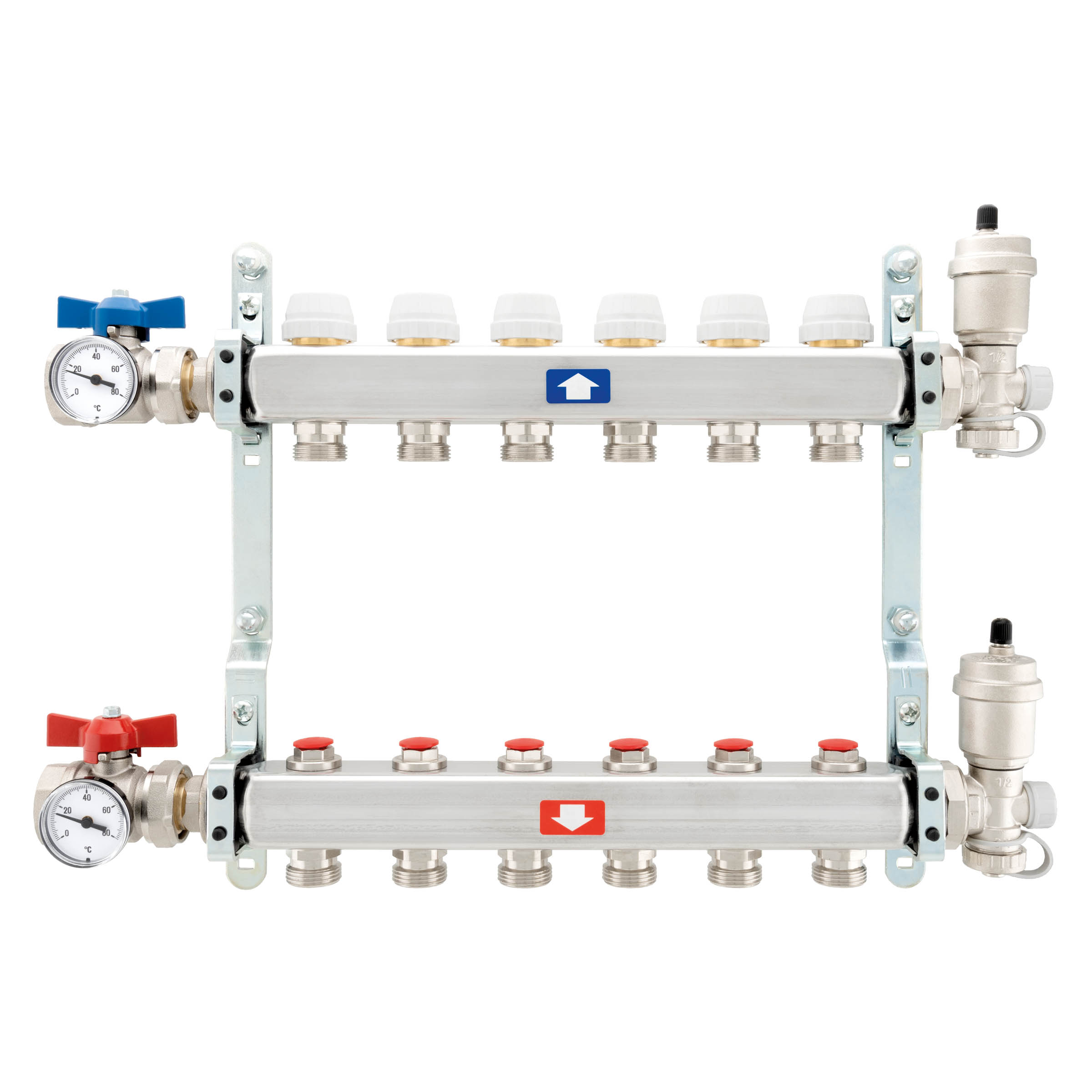 – 1 collecteur départ en acier inoxydable AISI 304L sans débitmètres